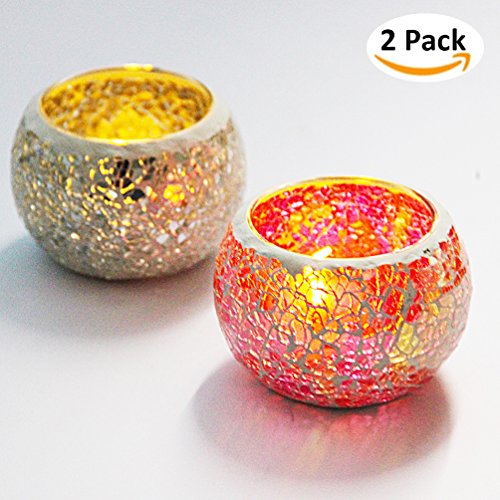 • >>1. Handmade Artwork Decor: Pack of 2, different pattern and 3.2 inch diameter, handicrafts decorative candle holder, thousands of small glass colorful fragment pasted on glass bowl, beautiful cultural collectibles for home, office and gift. (NOTICE: Inner gift LED candle may be low energy and weak because long time stored, replace battery.)